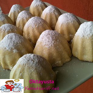 175 derecelik fırında hafif kızarana kadar pişiriyoruz. Çıkardıktan sonra servis tabağına alıyoruz. Pudra şekeri serpip, servise sunuyoruz.