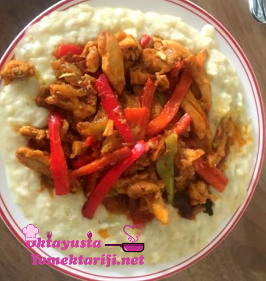 Servis tabağına önce beğendimizi koyuyoruz. Onun üzerine de tavuk sotemizi koyuyoruz.