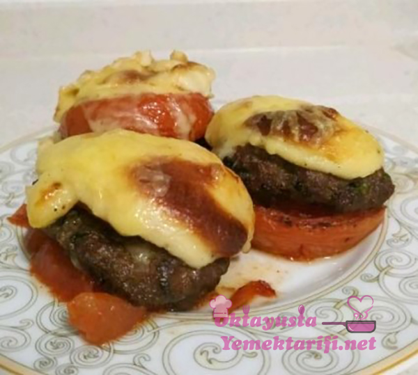 Borcama ya da fırın tepsisine bir sıra domates dizip, üzerilerine köfte koyuyoruz. Köftenin üzerine de bir dilim domates yerleştiriyoruz.