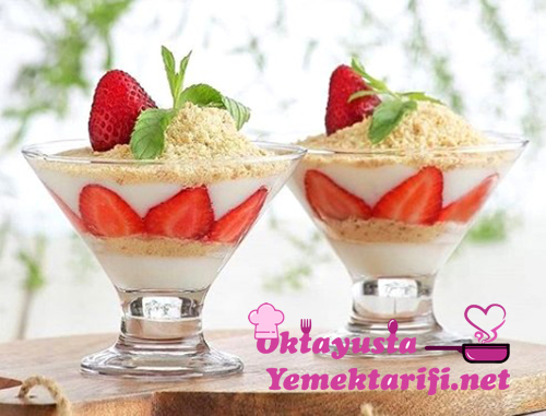 Kuplarımıza biraz muhallebi koyuyoruz. Ardından biraz bisküvi koyup, kenarlarına çilek dilimleri sıralıyoruz. Tekrardan muhallebi koyuyoruz. En üstü de bisküvi ile kaplayıp, çilek ile süslüyoruz.