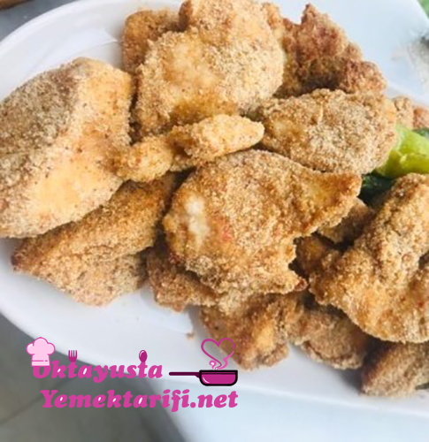 Ardından bir tabağa galeta ununu koyuyoruz. Sosladığımız tavuk etlerinin her yerini galeta ununa buluyoruz.