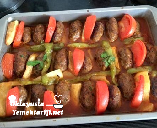 Tepsimize köfte patates şeklinde diziyoruz. Dilerseniz tepsinin alt kısmına patateslerden koyabilirsiniz. Ardından aralara domates ve biber dilimleri koyuyoruz.