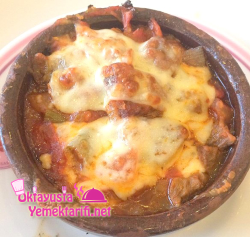 Yemeğimizi güveç kaplarına paylaştırıyoruz. Üzerlerine de kaşar peyniri rendesi ekliyoruz.