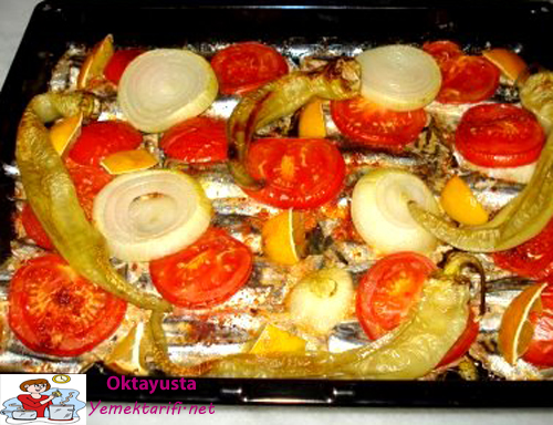 Domateslerin bü tanesini kenara ayırıp diğerini küp küp doğrayın. Soğanı halka halka, maydanozu ince ince doğrayın. Bir fırın tepsisine hamsilerin yarısını, sırt kısımları altta kalacak biçimde dizin.