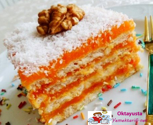 Üzerini hindistan cevizi ile kaplıyoruz. Buzdolabında soğuttuktan sonra dilimleyerek, servise sunuyoruz.