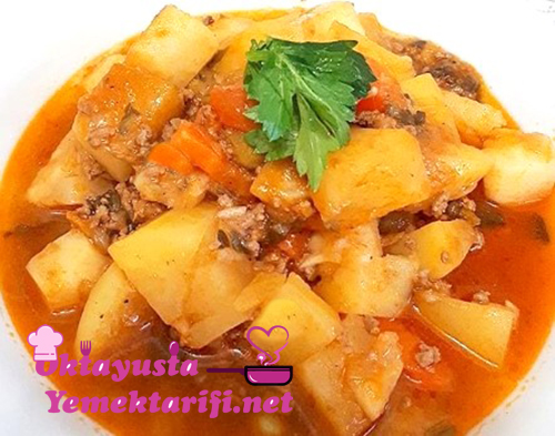Havucu katıyoruz. Bir kaç dakika kavurduktan sonra patatesi ilave edip, onu da bir kaç dakika kavuruyoruz. Üzerilerini geçecek kadar sıcak su ekliyoruz.
