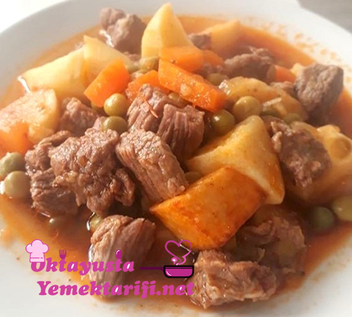 Biraz kavurduktan sonra etleri ekliyoruz. Daha sonra salçayı katıyoruz. Bir tatlı kaşığı tereyağını daha katıyoruz. Üzerini geçecek kadar sıcak su ilave ediyoruz. Tuzunu ayarlıyoruz. Kızarttığımız patatesleri ekliyoruz. Kapağı kapalı olarak yaklaşık yarım saat kontrol ederek, pişiriyoruz. Ardından bezelyeleri ilave ediyoruz. Bezelyelerimiz de yumuşayınca altını kapatıyoruz.