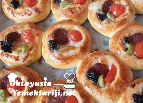 Daha sonra birer dilim domates, biber, sucuk ve zeytin koyuyoruz. Malzemeleri zevkinize göre çoğaltabilirsiniz.