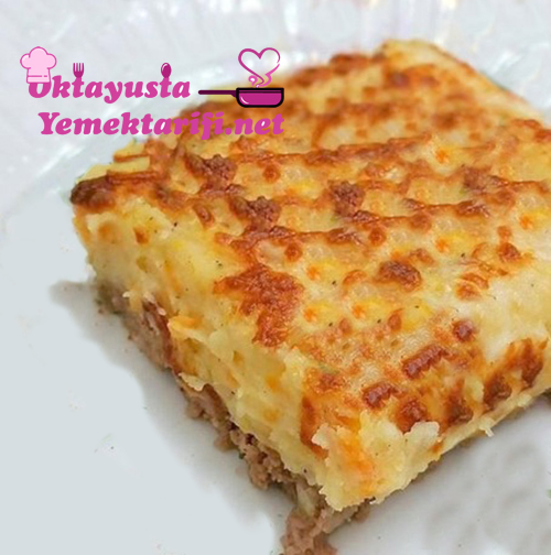 Kızaran köftemizi fırından alıp, püreyi üzerine döküp, yayıyoruz. Rendelenmiş kaşar peynirini üzerine serpip, tekrardan fırına veriyoruz. Kaşarlar eriyip, kızarana kadar fırından tutup, alıyoruz ve biraz dinlendirip, sıcak olarak dilimleyerek servise sunuyoruz.