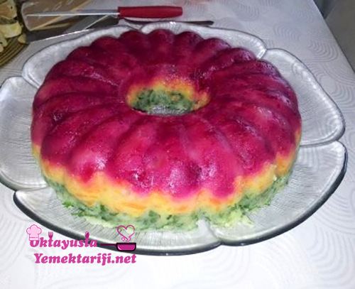 Kek kalıbına streç film seriyoruz. En alta pancarlıyı koyup, yayıyoruz. Onun üzerine havuçluyu, onun da üzerine yeşillikli olanı koyup, yayıyoruz. Ardından buzdolabına kaldırıyoruz. 4-5 saat dinlendirdikten sonra kalıbı ters çevirip, çıkarıyoruz ve streci alıyoruz. Ardından dilimleyerek servise sunuyoruz.
