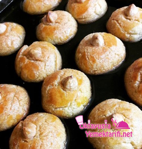 Hamurumuzdan parçalar koparıp, elimizde yuvarlıyoruz ve hafif yassı tatlılarımızı yapıyoruz. Yağladığımız tepsiye diziyoruz.