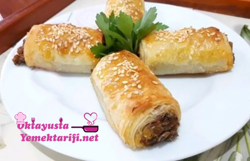 İlk yufkayı tezgaha yayıyoruz ve sosumuz ile her yerini sosluyoruz. Bir kenarını yarısını kadar katlıyoruz. Diğer kenarını da onun üzerine katlıyoruz. Tekrardan sosumuzdan sürüyoruz. Dikdörtgene benzer şekil oluyor. Harcımızı bir kenarına yufkanın boyu boyunca koyuyoruz. Sağ ve sol kenarını hafif içeri katlayıp, rulo şeklinde sarıyoruz ve ardından bıçak ile dilimleyip, yağlı kağıt serdiğimiz tepsiye diziyoruz.